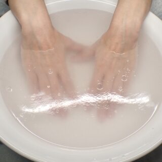 ハンドバスに使用している入浴剤はパパイン酵素やコラーゲンが配合されているので、浸かっているだけでもお肌がつるつるに♪1剤、2剤を合わせることにより発泡した状態になり、炭酸ガス効果で血行促進!指先は血流が悪くなりがちだったら冷えてる方も多いので、バブルバスはお客さまにも人気です。